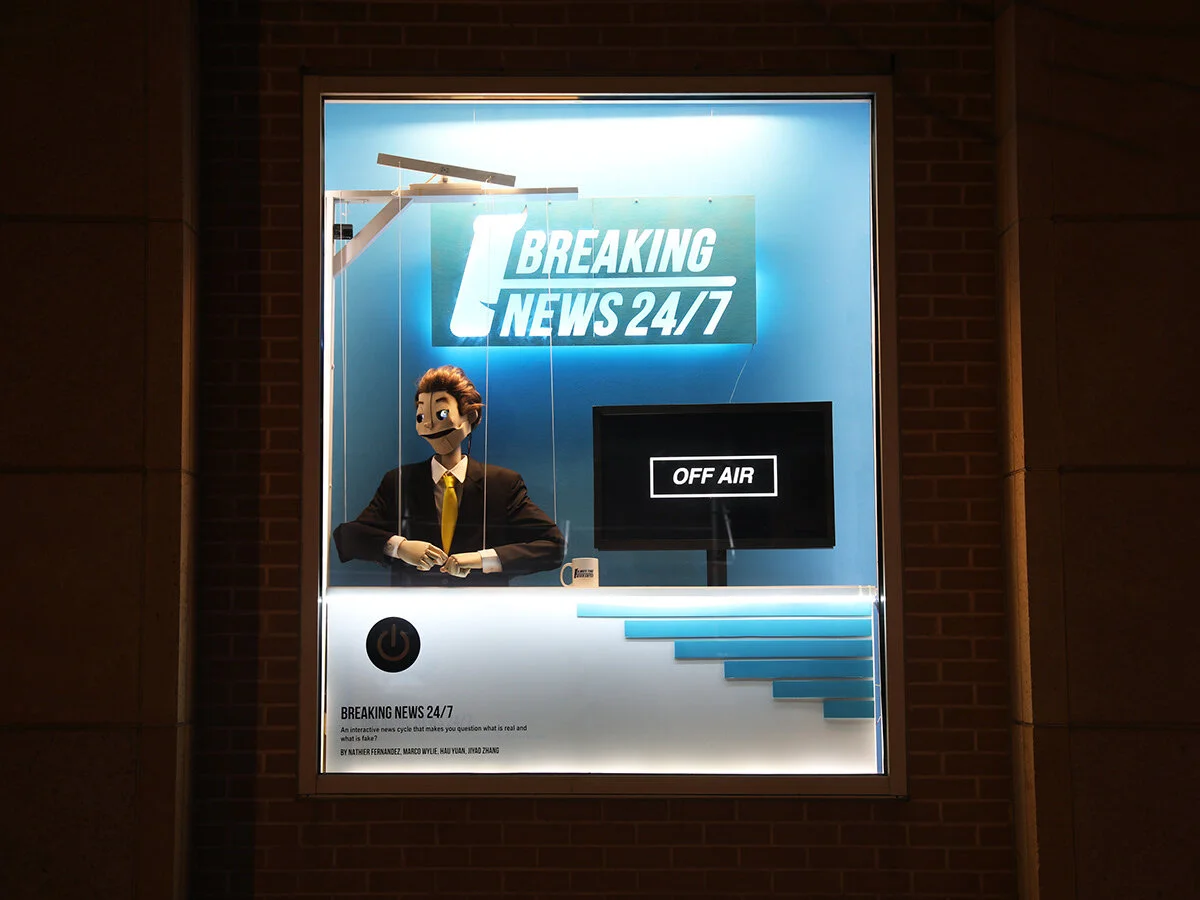 The window was transformed into a news channel that broadcasts problematic and controversial news found on the Internet. The newscaster, the iconic and most appealing element of the project, is a Pinocchio, who is notably characterized for his frequent tendency to lie, which causes his nose to grow.